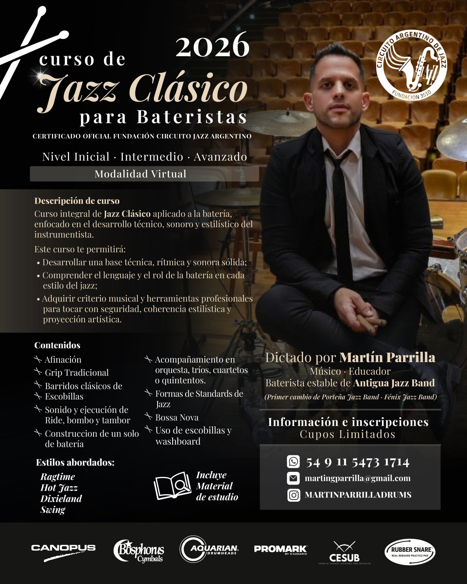 Baterista profesional con más de 20 años de trayectoria en la escena musical argentina. Fundador del Centro de Estudios Superior para Bateristas (CESUB).